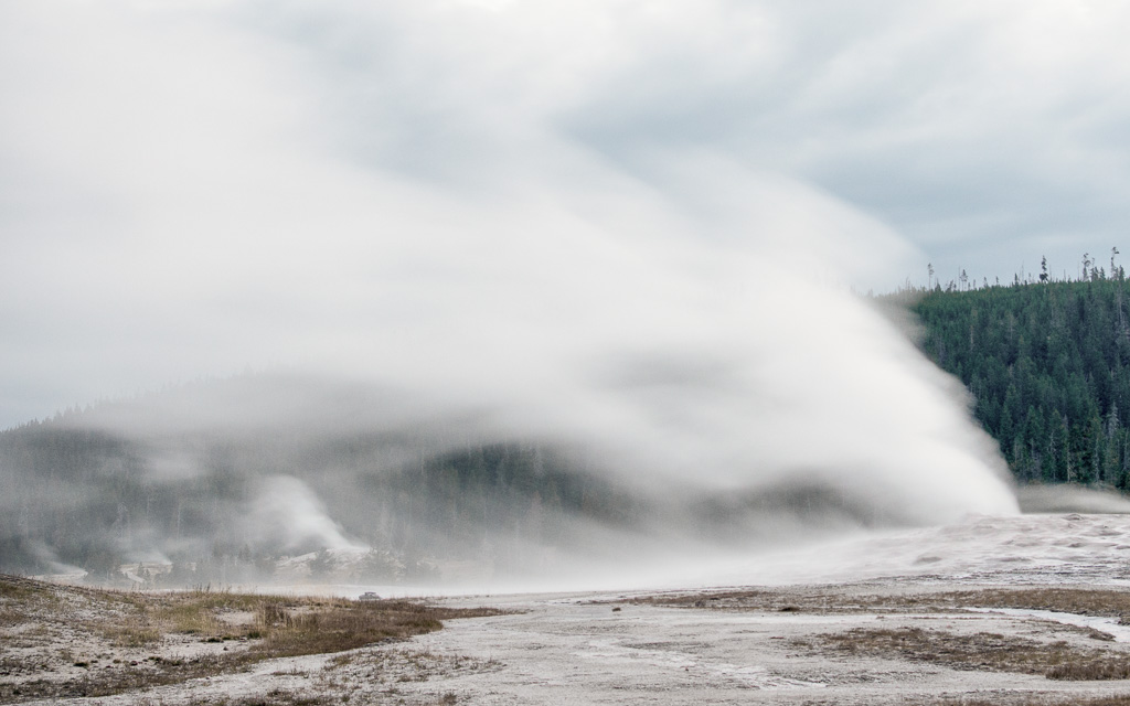 We arrived at Old Faithful geyser basin before sunrise (~6:00 am) and started perusing the boardwalk for good shooting angles. We were the only two people visible in the entire area. It was an erie feeling, but a great place to await the sunrise.